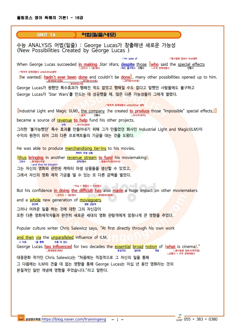 올림포스 영어독해의 기본1 - 16강 지문분석 및 한줄해석