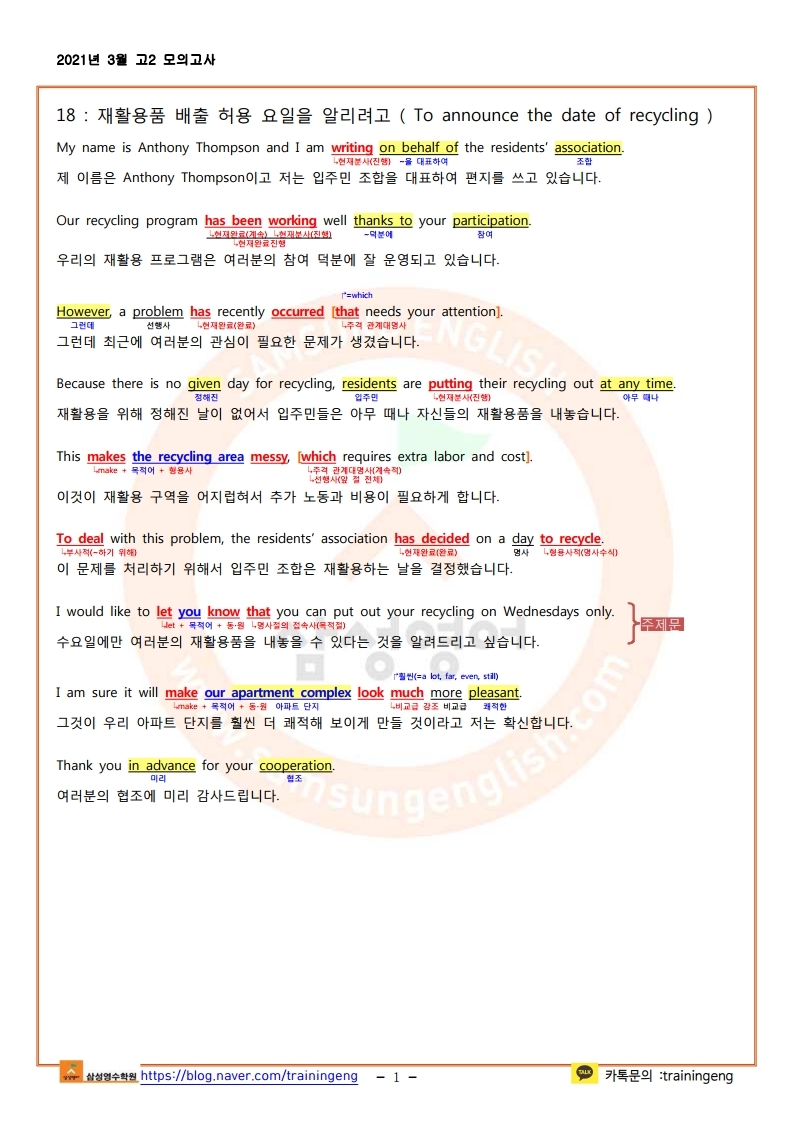 2021년 3월 고2 모의고사 한줄해석 및 지문분석(25,27,28,43~45제외)