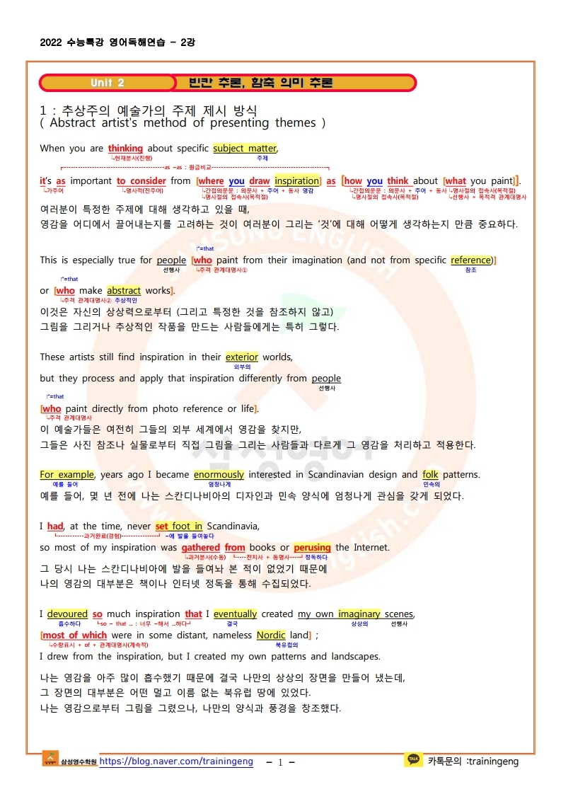 2022 수능특강 영어독해연습 2강 지문분석 및 한줄해석(일부지문 1~10)