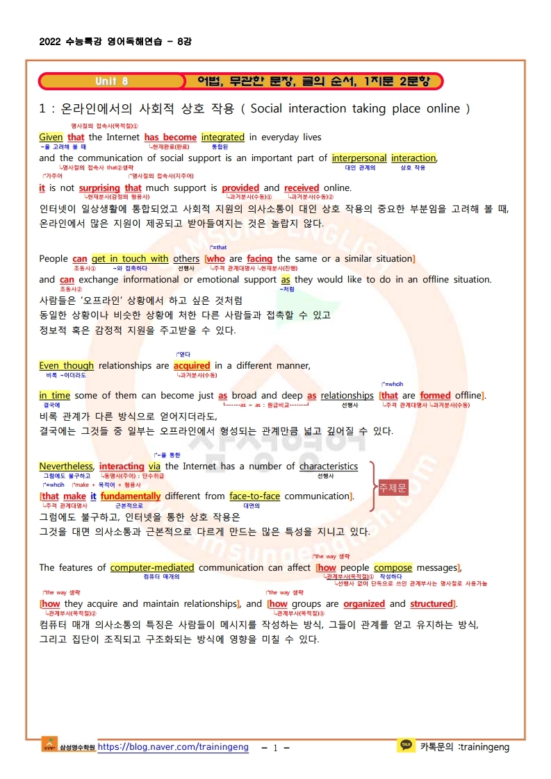 2022 수능특강 영어독해연습 8강 지문분석 및 한줄해석(장문제외)