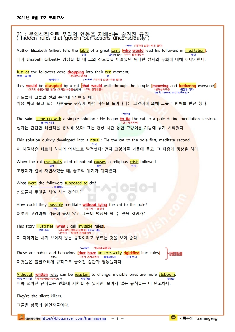 2021년 6월 고2 모의고사 한줄해석 및 지문분석(18~20, 22, 23, 25~28, 31, 43~45제외)