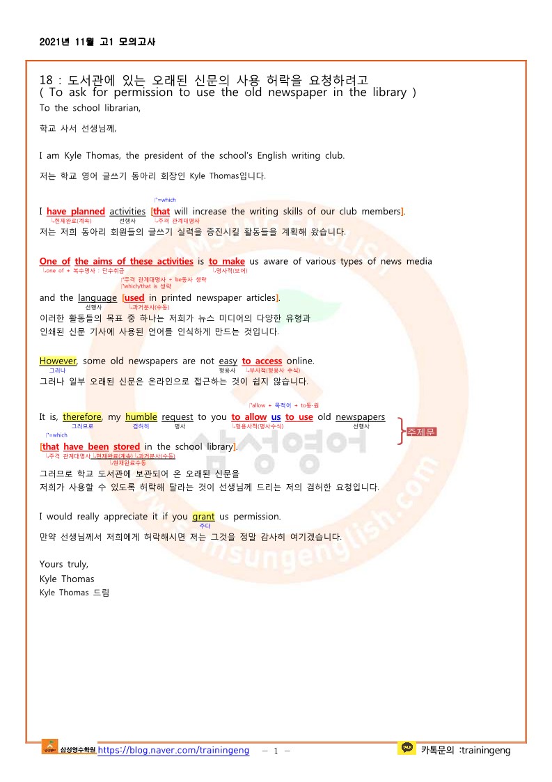 2021년 11월 고1 모의고사 한줄해석 및 지문분석(25,27,28,41~45제외)