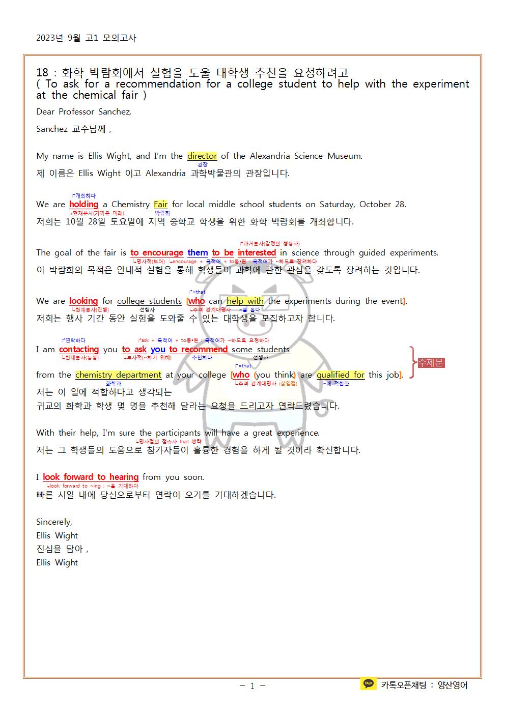 2023년 9월 고1 모의고사 한줄해석 및 지문분석