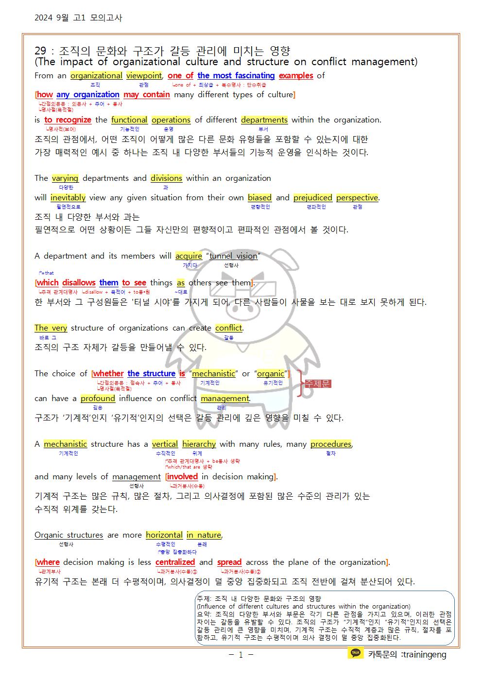 2024년 9월 고1 모의고사 한줄해석 및 지문분석