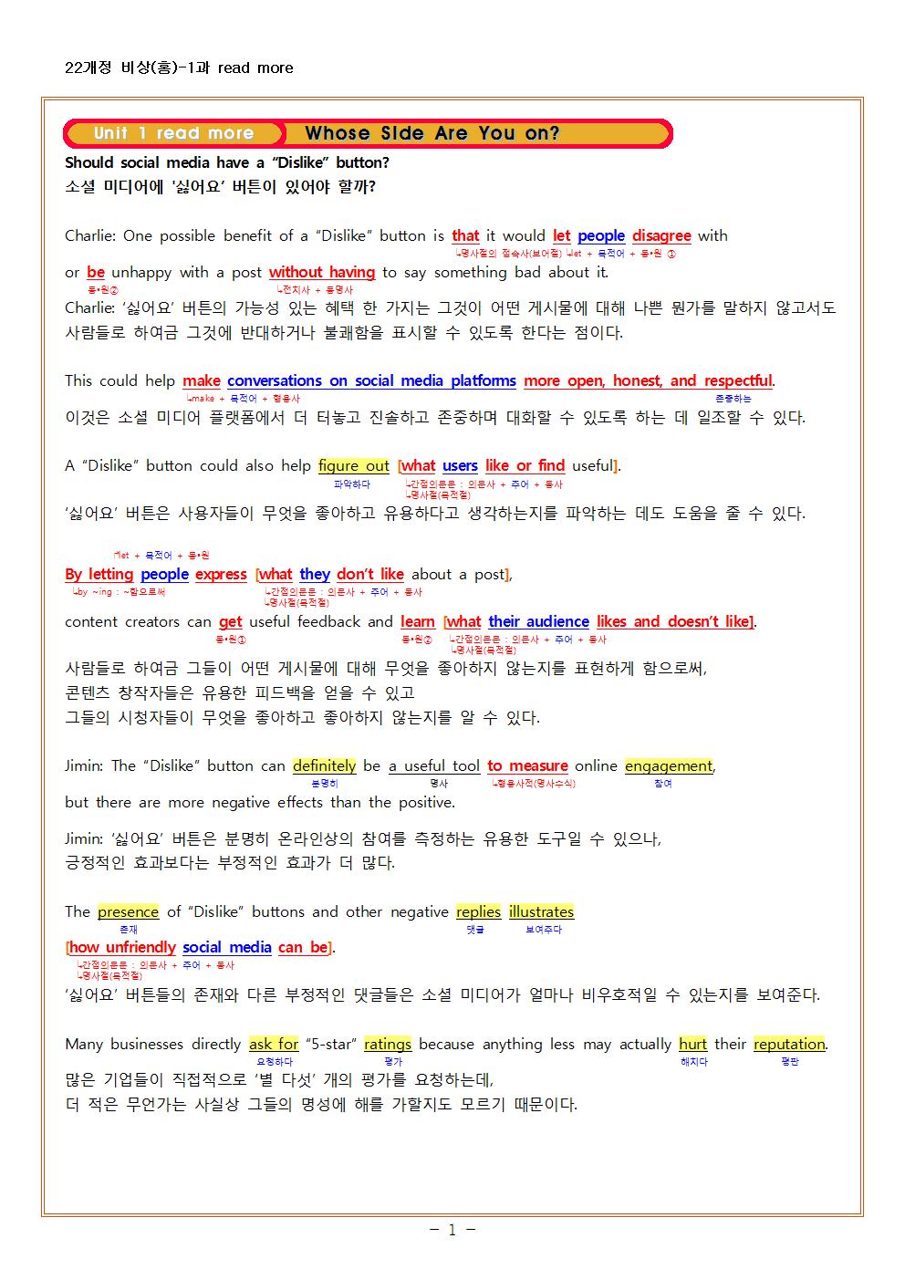 | 2022개정 공통영어1 비상(홍) 3과 read more 상세분석(5/17 수정) (1) | 2025.05.04 |