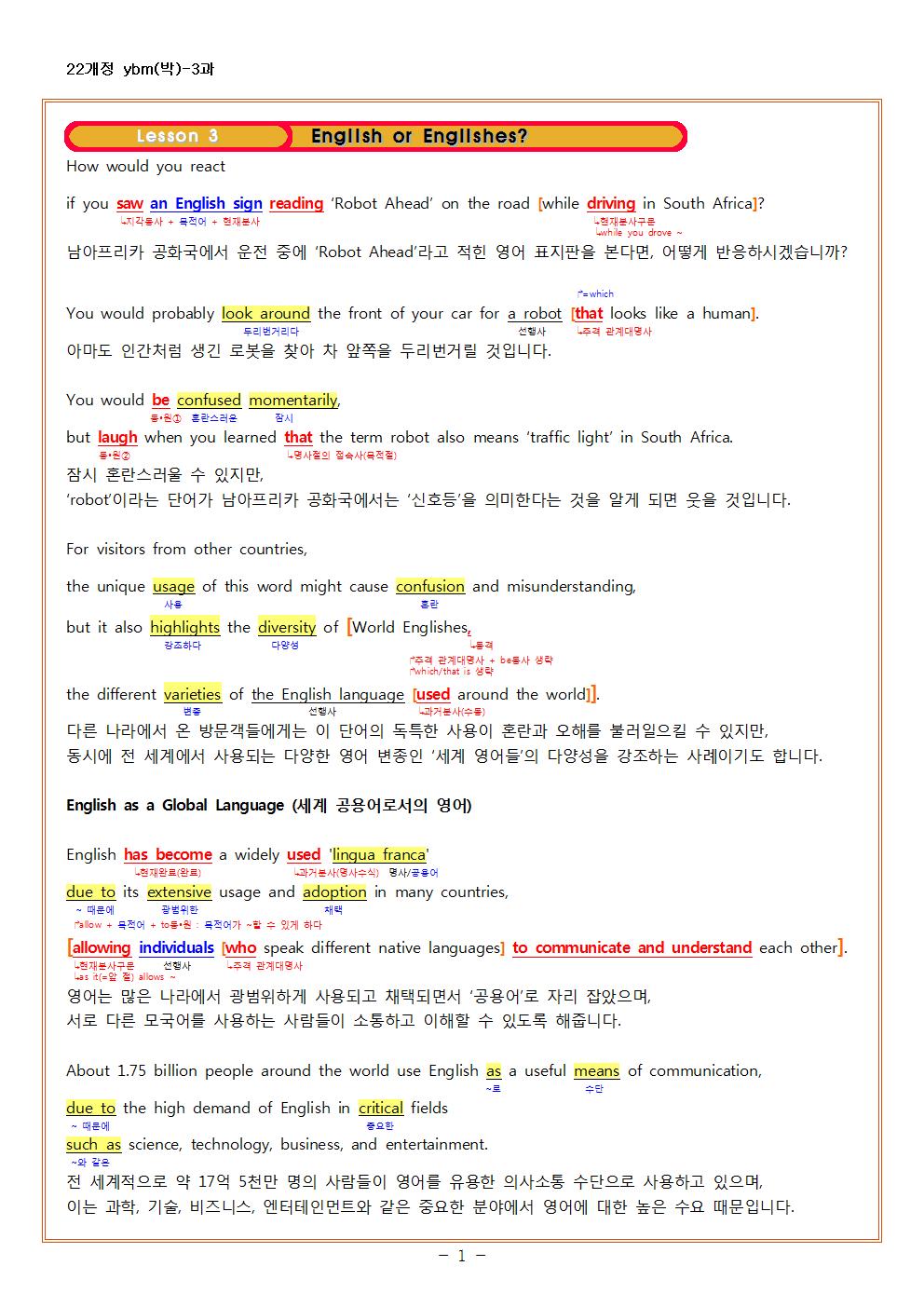 | 2022개정 공통영어1 ybm(박) 1과 한줄해석 및 지문분석 (6) | 2025.03.08 |