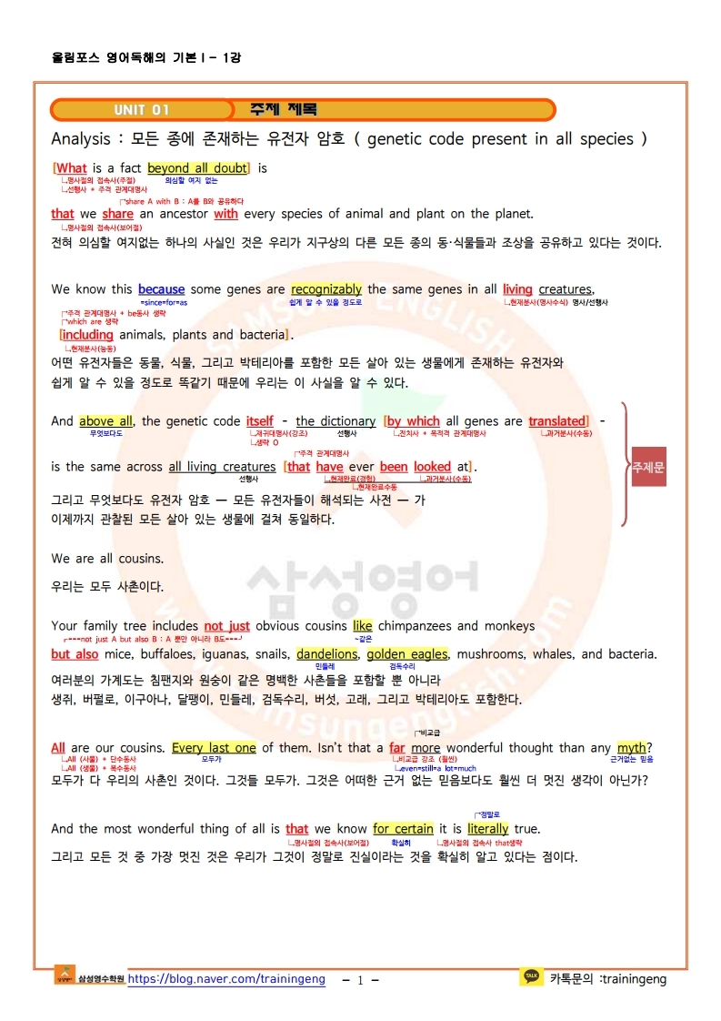 올림포스 영어 독해의 기본1 - 1강 한줄해석 및 본문분석