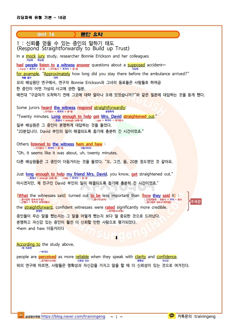 리딩파워 유형편 기본 - 16강 한줄해석 및 본문분석